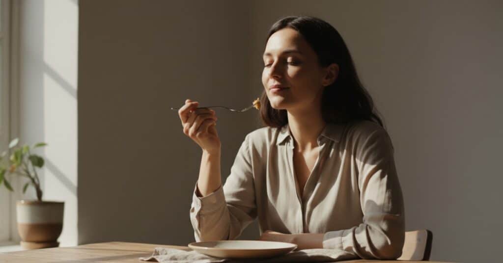 Digestion starts in the mind. When you eat in a state of stress, your body diverts blood away from digestion. Slow down, chew thoroughly, and create a calm environment around food.